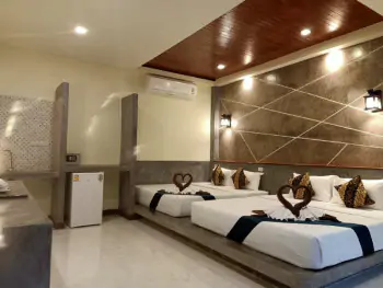 Our contemporary Thai-Style Air-Con Big Family Bungalow is set among the other family bungalows with the same peaceful luxury, but with 2 large double beds. The bungalow has also its own private balcony with a hammock, western-standard bathroom with hot shower, TV, refrigerator and remote controlled air-con. Furnishings and fittings are handmade from traditional local materials on the island. 35m2 including balcony.